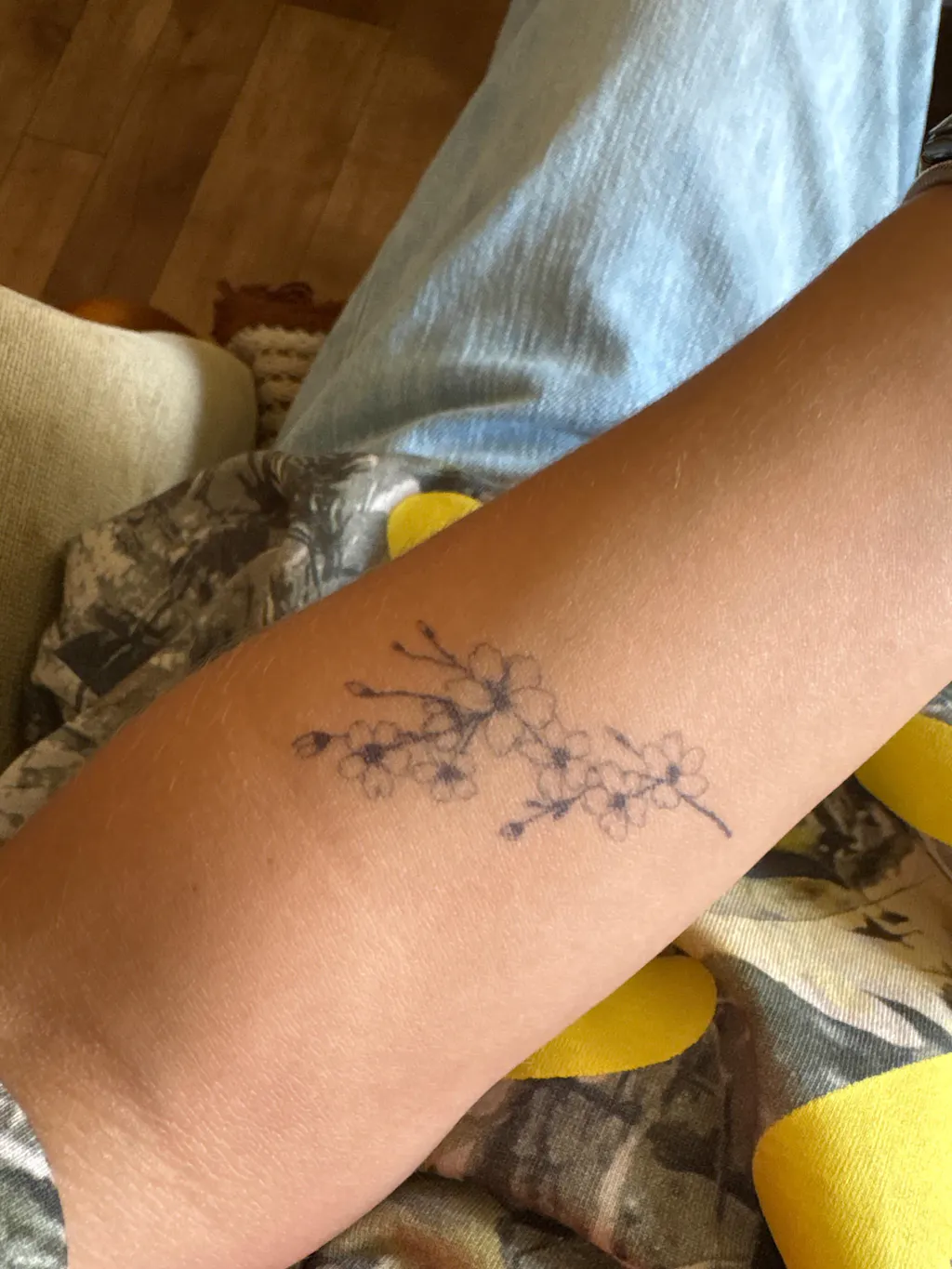 Dobrze się trzymał, rzeczywiście około 2 tyg zanim zaczął się ścierać, długie rękawy w zimie dały mu trochę ciężki czas ale podołał. Wybarwiał się na mojej skórze około 2 dni, przygotowałam wcześniej skórę kremem i ogoliłam włoski, nakładanie było banalnie proste przez jego rozmiary, nie było trudno dopilnować żeby się nie rozjechał. Zdjęcia z różnych momentów podczas tych 2 tygodni
