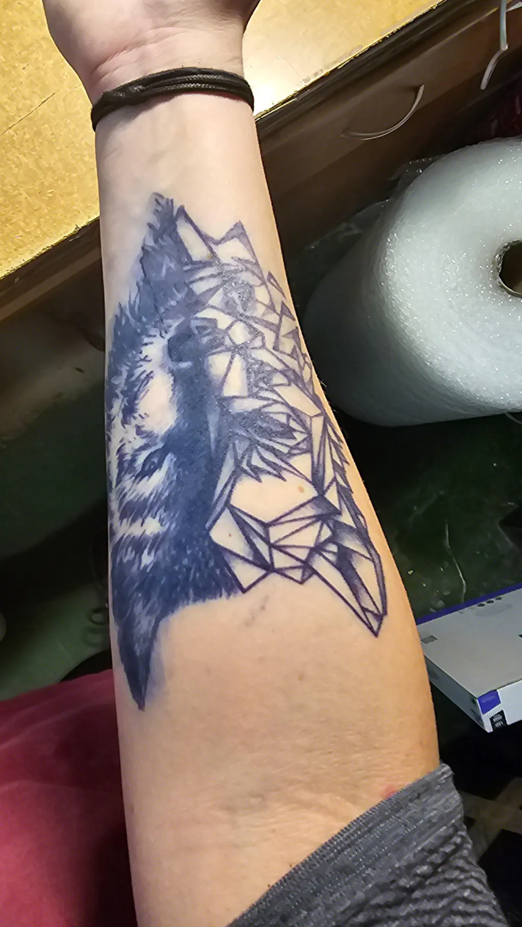 Opis: Tatuaż przedstawiający wilka w połowie realistycznego, a w połowie geometrycznego. Symbolizuje harmonię między naturą a nowoczesnością, dzikość oraz precyzję. Idealny wybór dla osób łączących w sobie instynkt i analityczne podejście.
